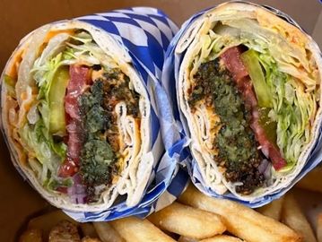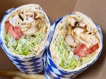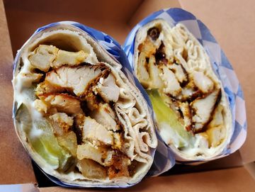 Juicy and flavorful shawarma chicken topped with fries, pickles, drizzled with garlic aioli and our Lemon Tahini sauce, and wrapped in a fresh pita.