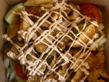 Your choice of protein (Chicken, Falafel, or BOTH) over a bed of lettuce mixed with oil and vinegar house dressing, topped with cucumbers, chickpeas, tomato, and red onion, drizzled with your selection of one of our signature tahini sauces.