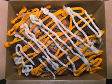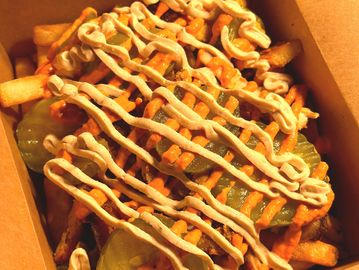 A bed of golden crispy fries with your choice of protein (Chicken, Falafel, or BOTH), topped with pickles and drizzled with your selection of one of our signature tahini sauces.