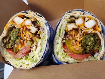 Both Chicken AND Falafel topped with lettuce, tomato, red onion and pickles, drizzled with Garlic Aioli and our Roasted Red Pepper Tahini sauce wrapped in a fresh pita. The best of BOTH WORLDS!